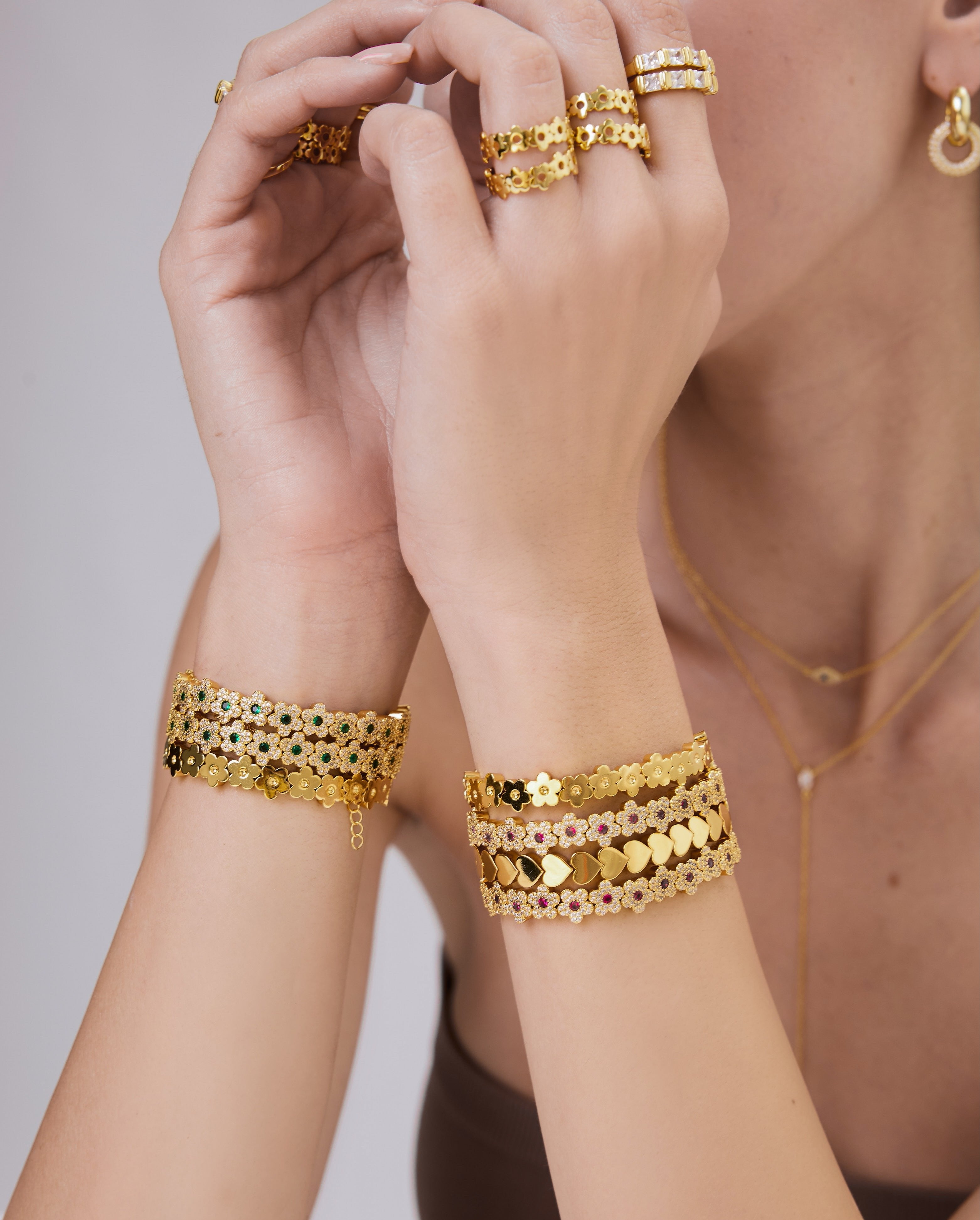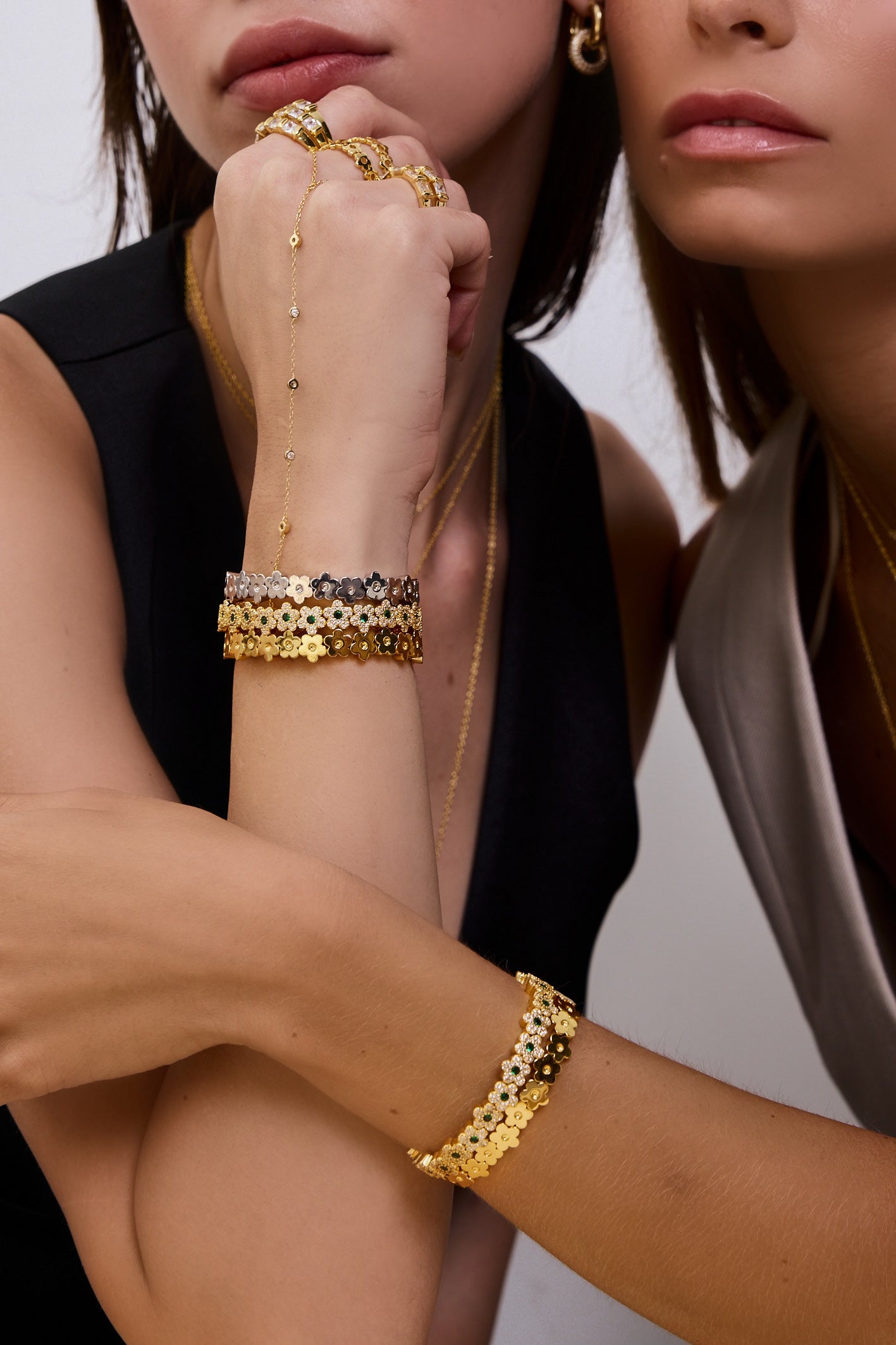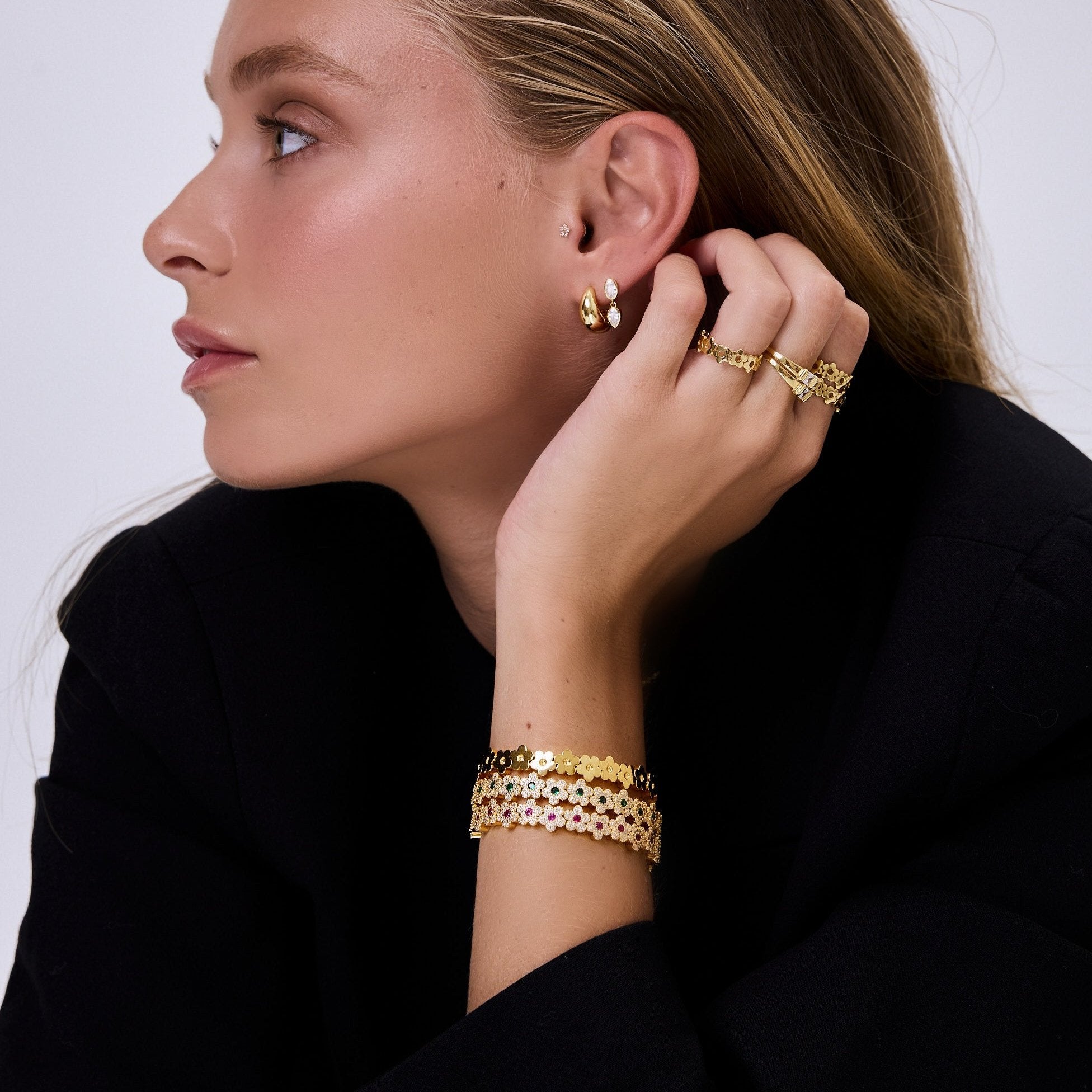 Add some flowers to your wrist stack with this beautiful, brass 18k gold-plated bracelet. The perfect stretchy, stackable wristband bracelet elevates every look.