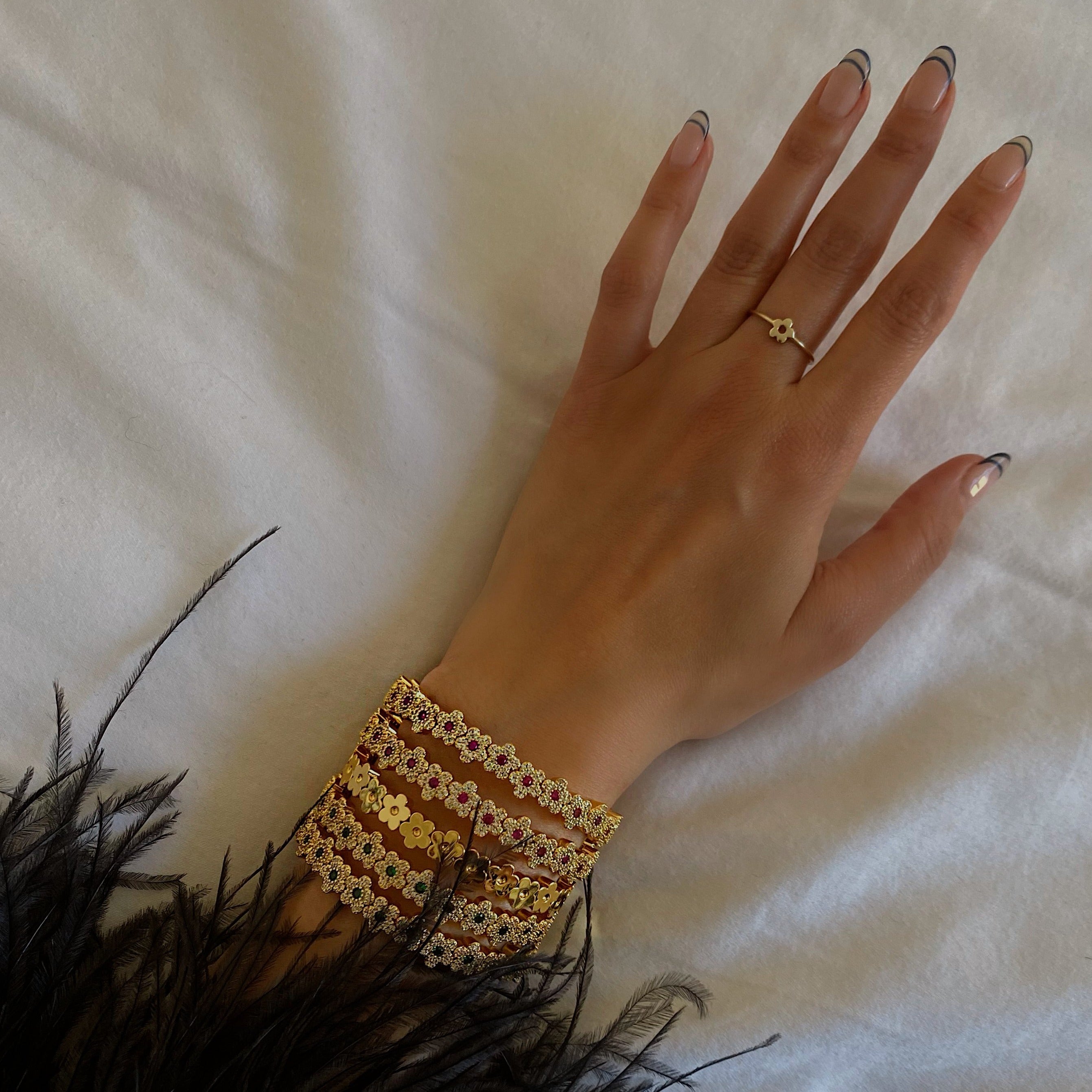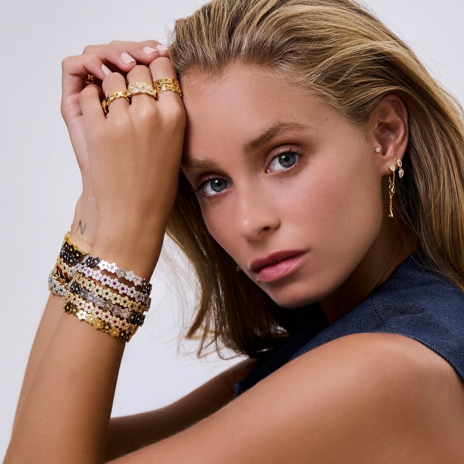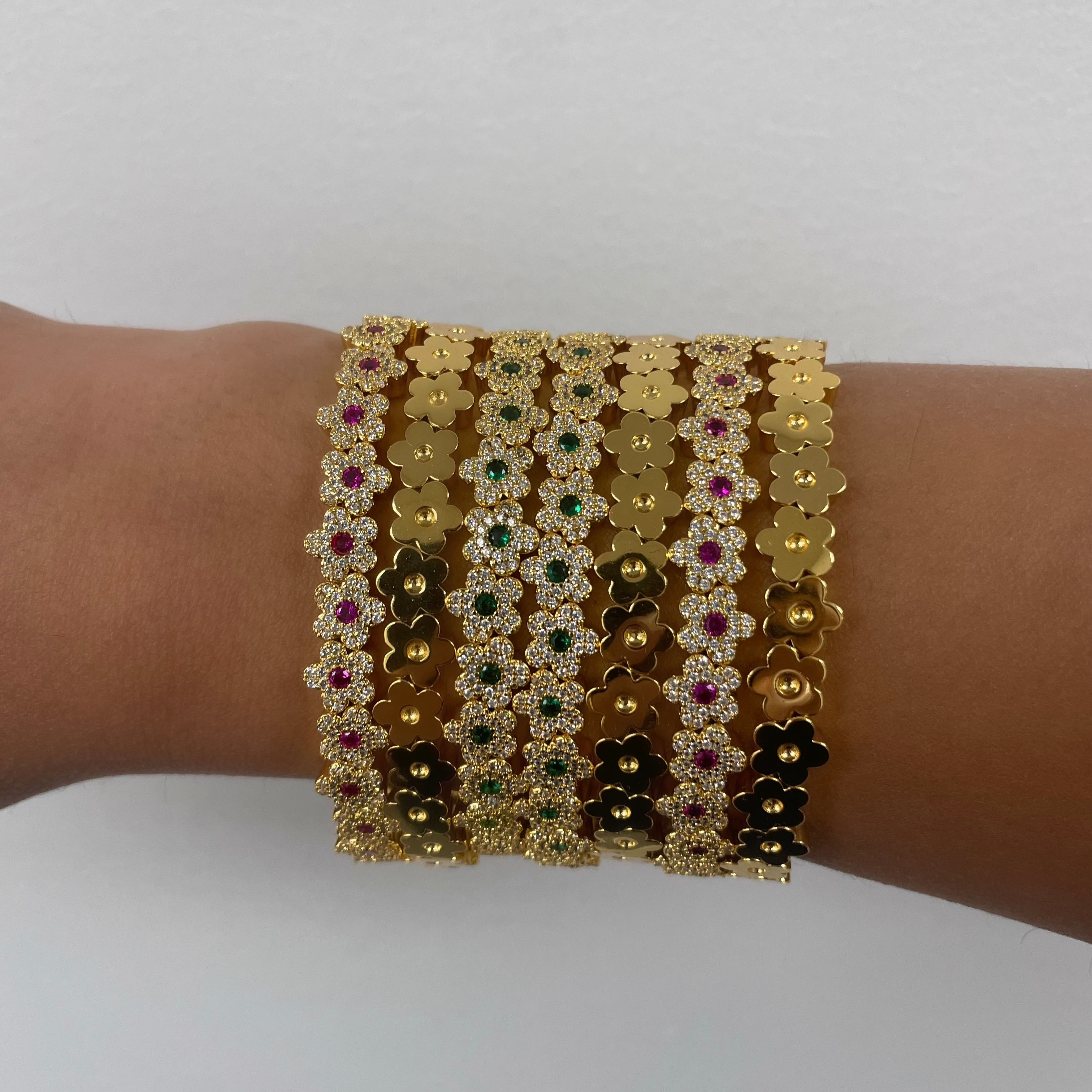 Just like a flower, you are beautiful and unique. Add some flowers to your wrist stack with our best-selling, brass 18k gold-plated bracelet. The perfect stretchy, stackable wristband bracelet elevates every look.
