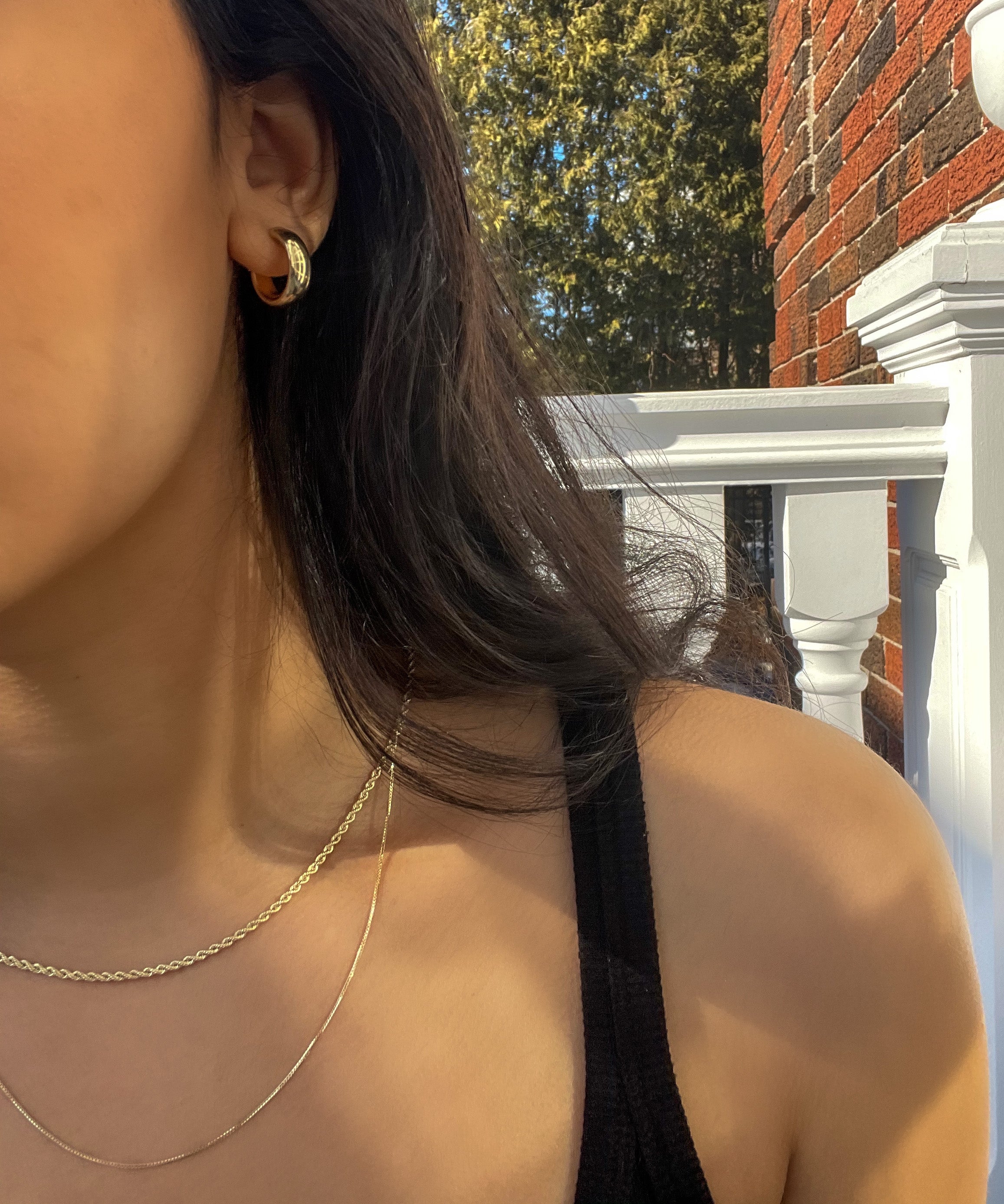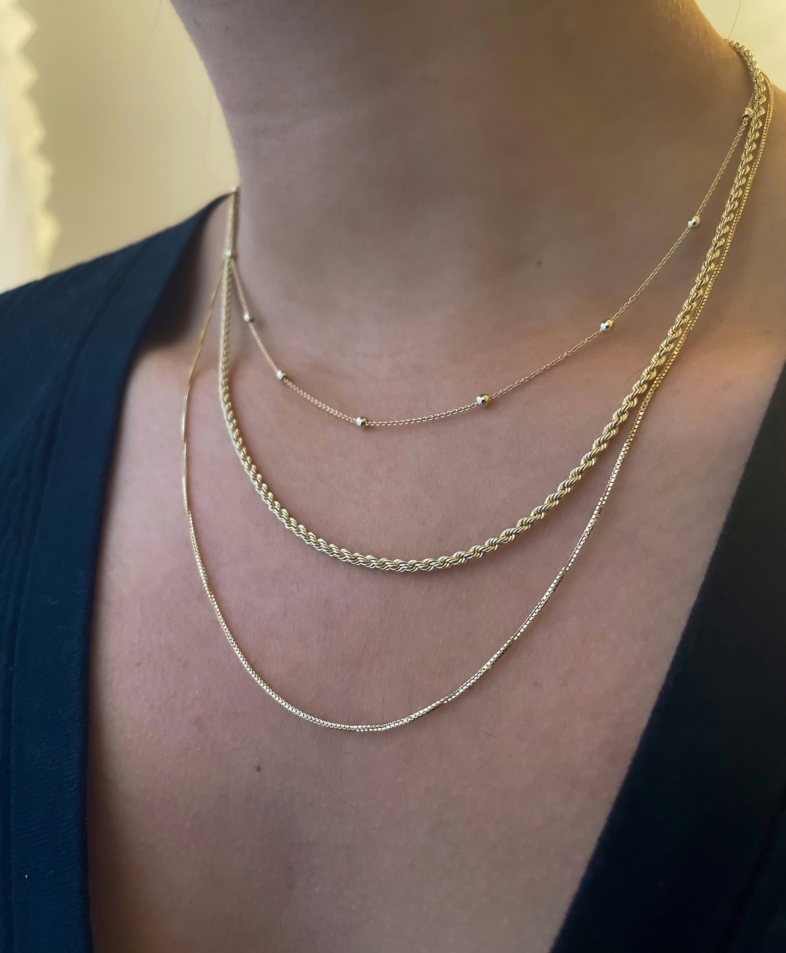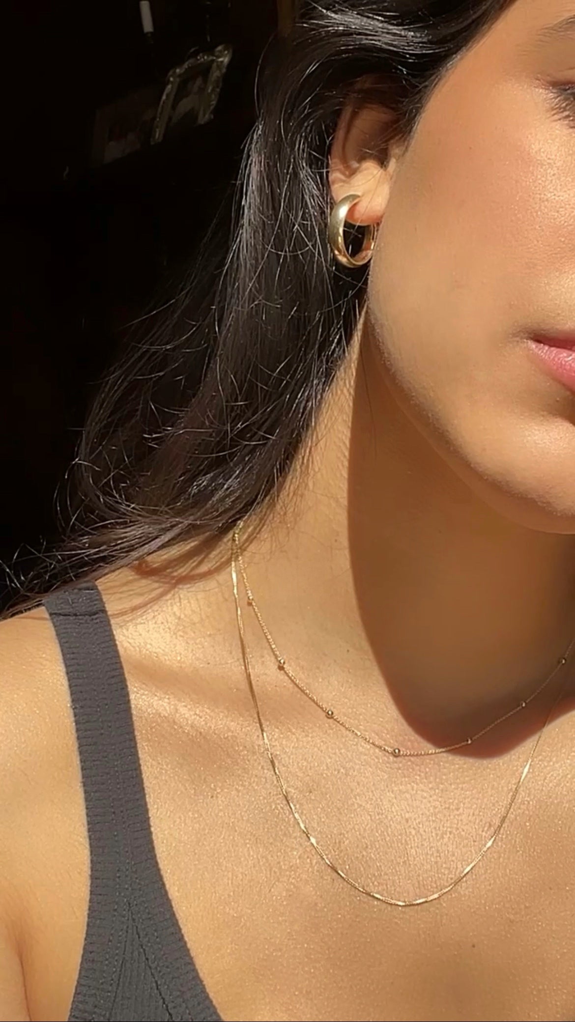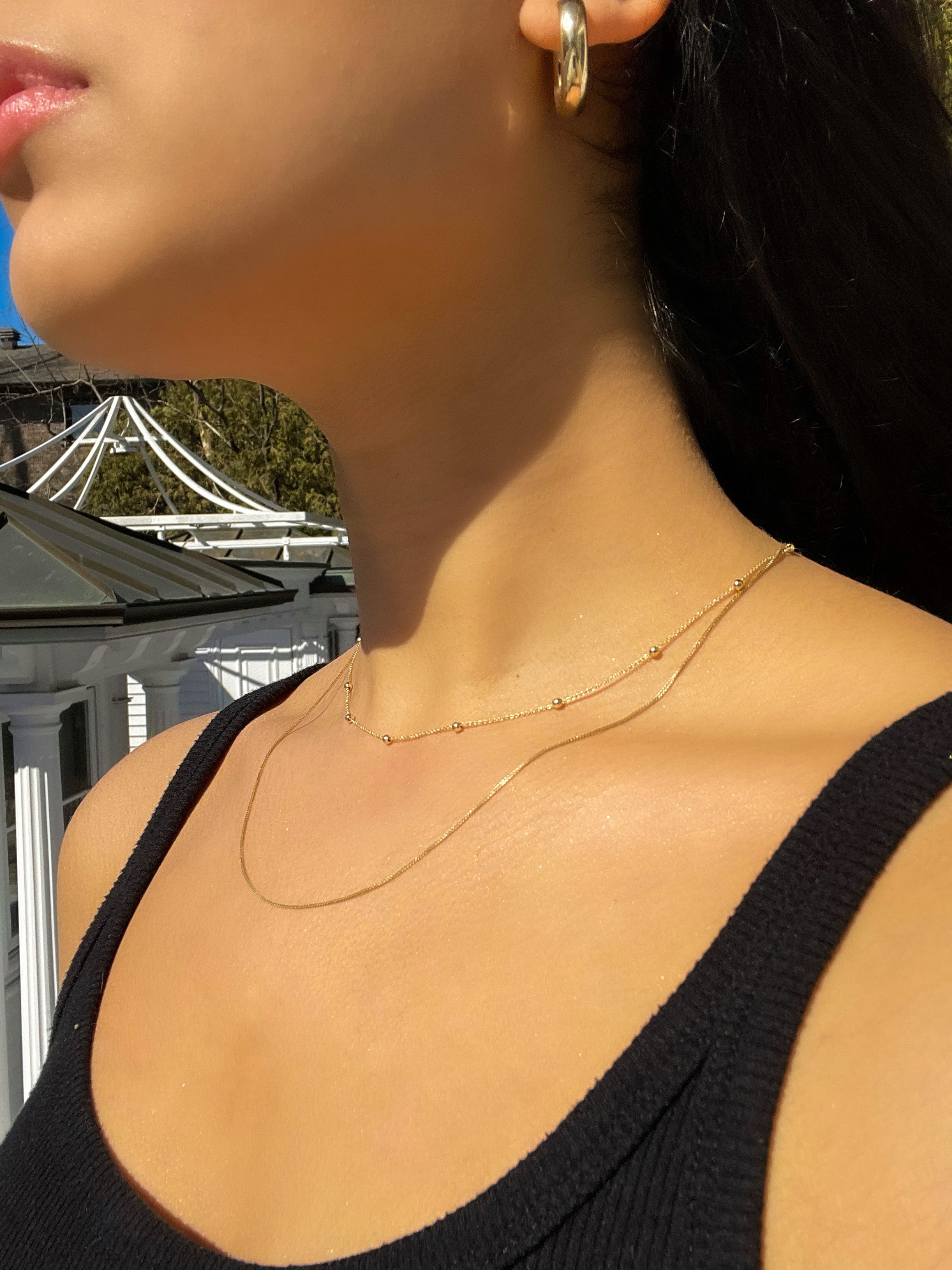 The Amelia Necklace is a classic box chain that’s light as air and catches the light just right.