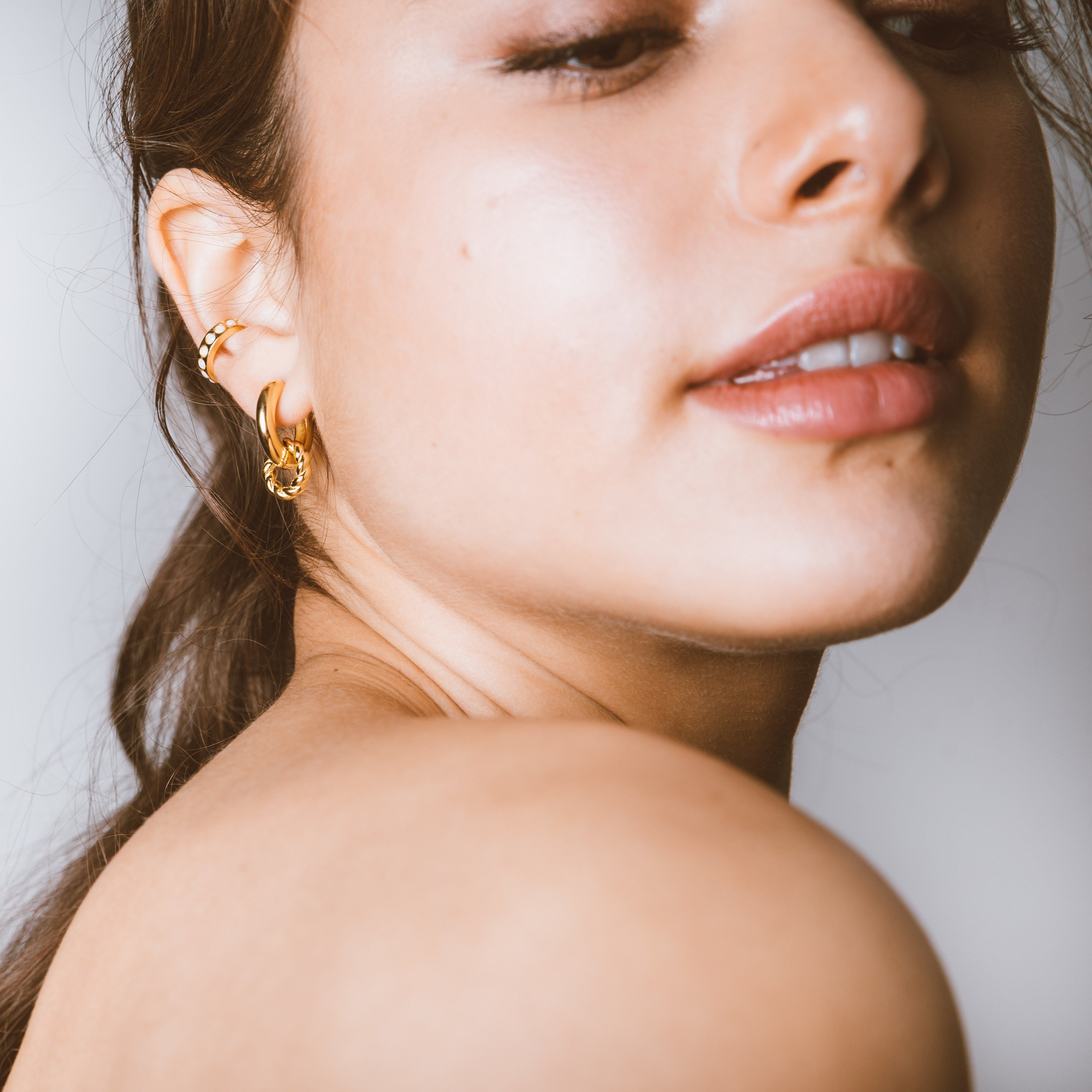 A thick layer of 18k gold over 925 sterling silver, designed to be durable and hypoallergenic—made for everyday wear with the look and feel of solid gold.